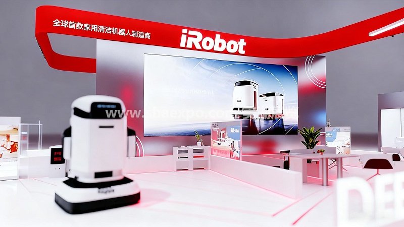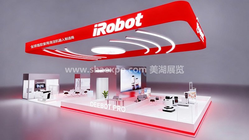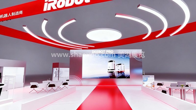 展臺最醒目的設(shè)計是頂部的紅色懸浮式燈箱結(jié)構(gòu),大面積紅色與白色 “iRobot” 品牌標識形成強烈視覺沖擊,搭配 “全球首款家用清潔機器人制造商” 的品牌定位語,在遠距離就能完成品牌信息傳遞。燈箱底部嵌入的環(huán)形燈帶與弧線造型,既呼應(yīng)了機器人導航的科技屬性,也為空間增添了動感與層次。