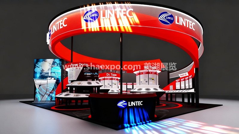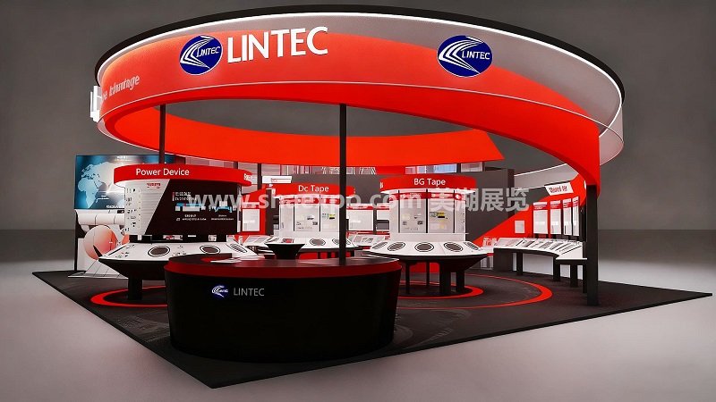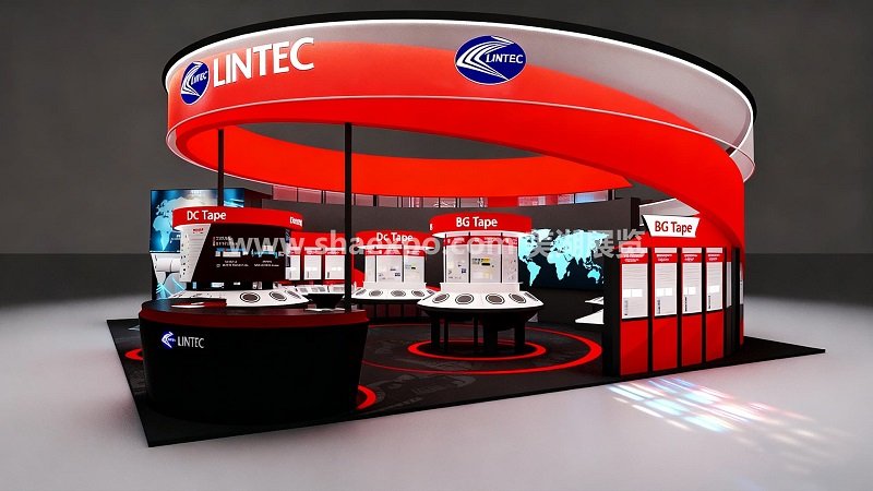 頂部的紅色弧形主視覺是整個設計的核心,不僅用高飽和度色彩制造了強烈的視覺沖擊,還通過 “LINTEC” 品牌標識的重復露出,在遠距離就能建立品牌認知。發光燈帶的嵌入讓頂部造型在展會環境中更具辨識度,也提升了夜間或弱光環境下的展示效果。