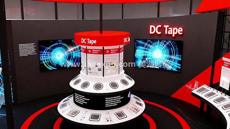在功能分區上,展臺以中央接待臺為樞紐,四周分散布置了 “Power Device”“Dc Tape”“BG Tape” 等主題展示區。這種布局既滿足了不同產品線的獨立展示需求,又通過環形動線讓參觀者自然銜接各個展區,避免了人流擁堵。接待臺采用黑色與品牌藍的配色,與頂部紅色形成視覺平衡,同時作為洽談與咨詢的核心觸點,增強了與客戶的互動性。